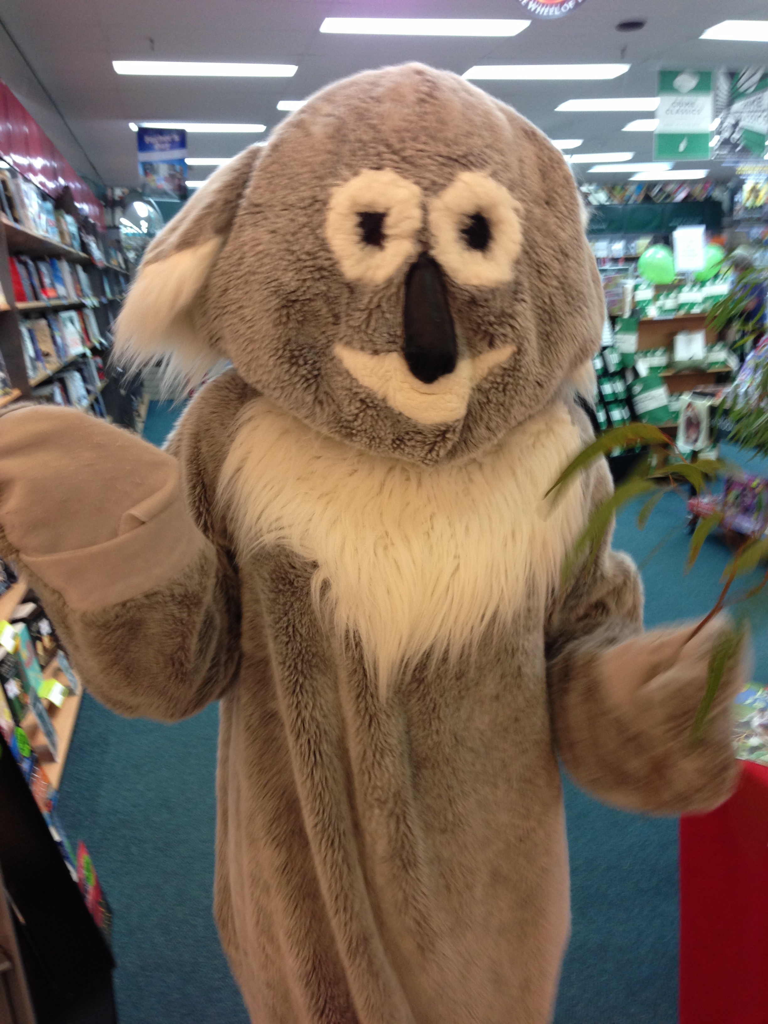Having a full bodied koala suit in the house can provide all sorts of unexpected entertainment. I hired one for a book signing a few weeks ago and was aghast on unpacking it to find the face was downright creepy. The black eyes sagged, the miserable mouth drooled. Not exactly the cuddly koala look I was hoping for.